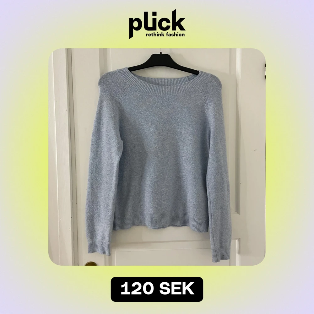 Mysig ljusblå stickad tröja från ONLY i storlek S. Den är i färgen på första bilden, de andra bilderna är ljusare pågrund av lampan! Tröjan har långa ärmar och ribbade kanter vid hals, ärmslut och nederkant. Använd få gånger därav säljs den.