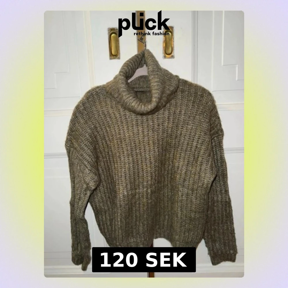 Mysig olivgrön stickad polotröja med grov ribbstickning och oversized passform. Tröjan har långa ärmar och en hög, bred polokrage som ger extra värme. Perfekt för kalla dagar och enkel att styla till jeans eller kjol.