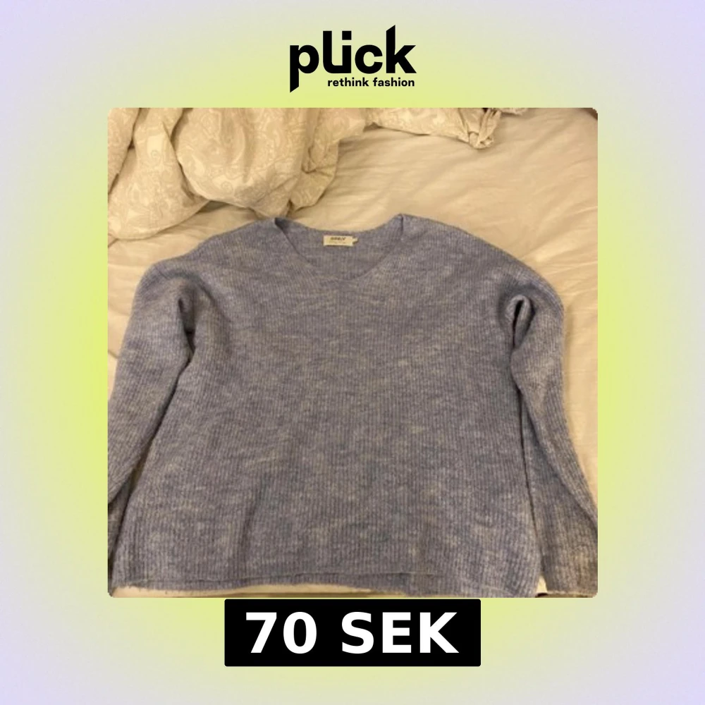 Säljer en mysig ljusblå stickad tröja från ONLY. Tröjan har en v-ringad hals och långa ärmar, perfekt för kyligare dagar. Den är i en mjuk och bekväm kvalitet som passar bra till både jeans och kjol.