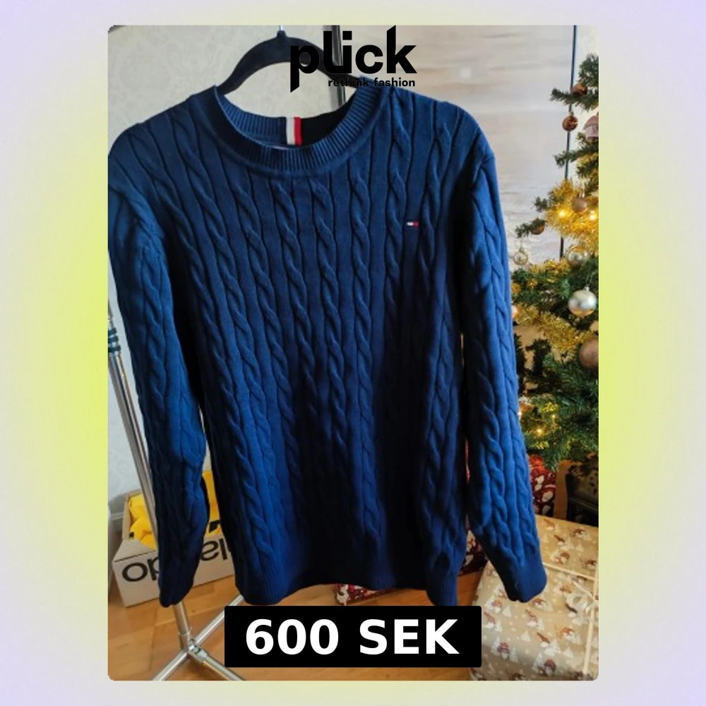 Säljer en marinblå stickad tröja från Tommy Hilfiger i storlek L. Tröjan har ett klassiskt kabelstickat mönster, rund halsringning och långa ärmar. Diskret logga broderad på bröstet och ribbade muddar vid hals, ärmslut och nederkant. Perfekt för kyliga dagar.