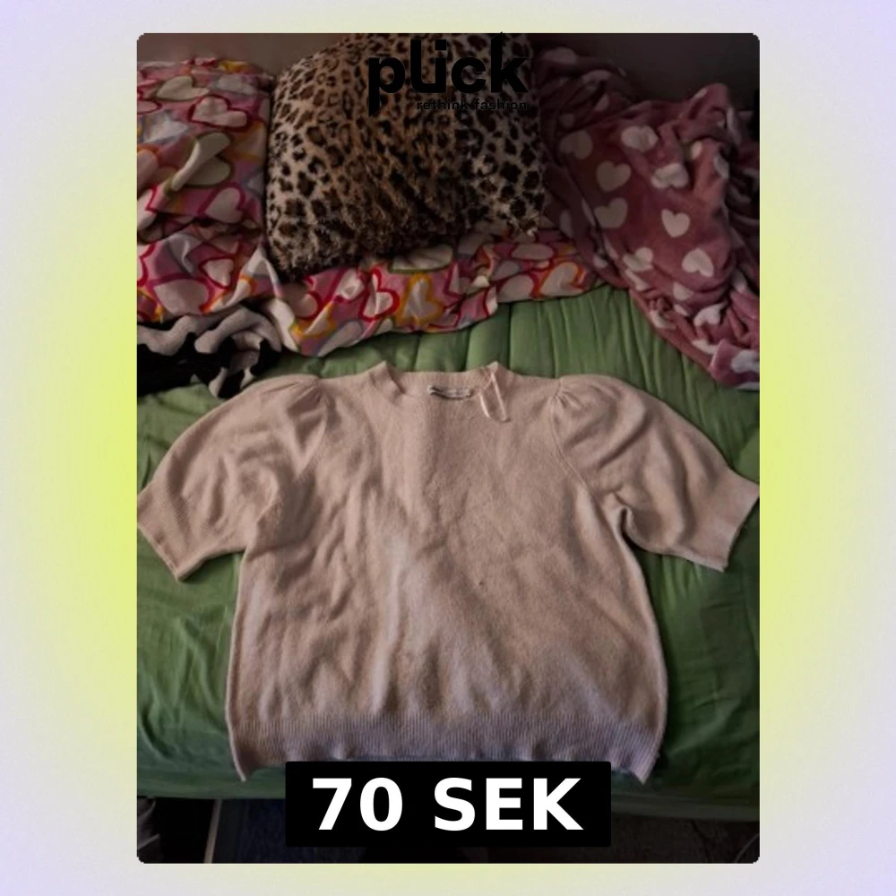 Säljer en beige stickad tröja, med puffiga korta ärmar och ribbade muddar. Tröjan har en enkel, stilren design och är perfekt för lager på lager under höst och vår. Superskön och lätt att matcha med allt! Men har dock en liten fläck, en liten mascara fläck.