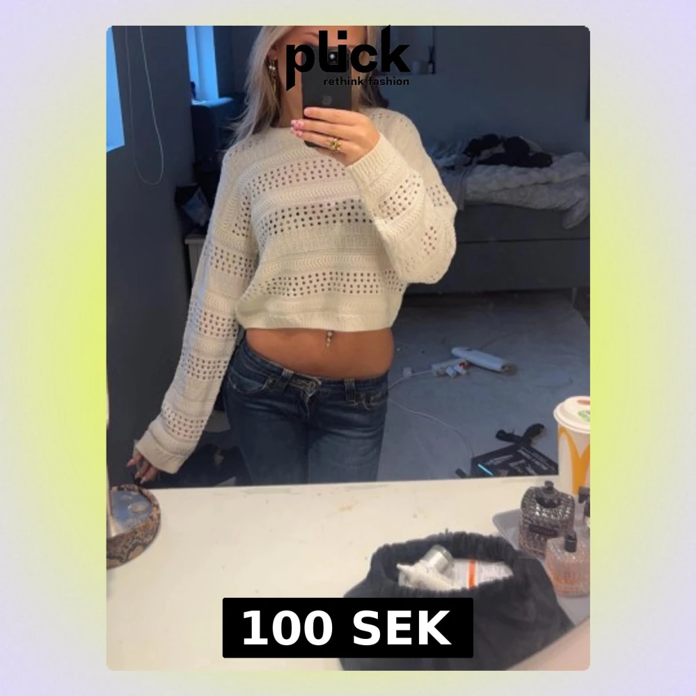 Säljer en vit stickad cropped tröja med breda ärmar och hålmönster. Tröjan har en avslappnad passform och är perfekt att styla med jeans. Materialet känns mjukt och luftigt, och den har ett modernt, ungdomligt snitt.