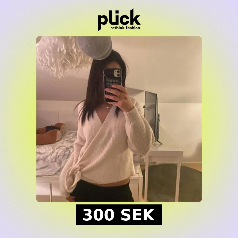 Säljer en mysig vit omlottstickad tröja med långa ärmar. Har en stilren design med knytning i sidan. (INTE FRI FRAKT)