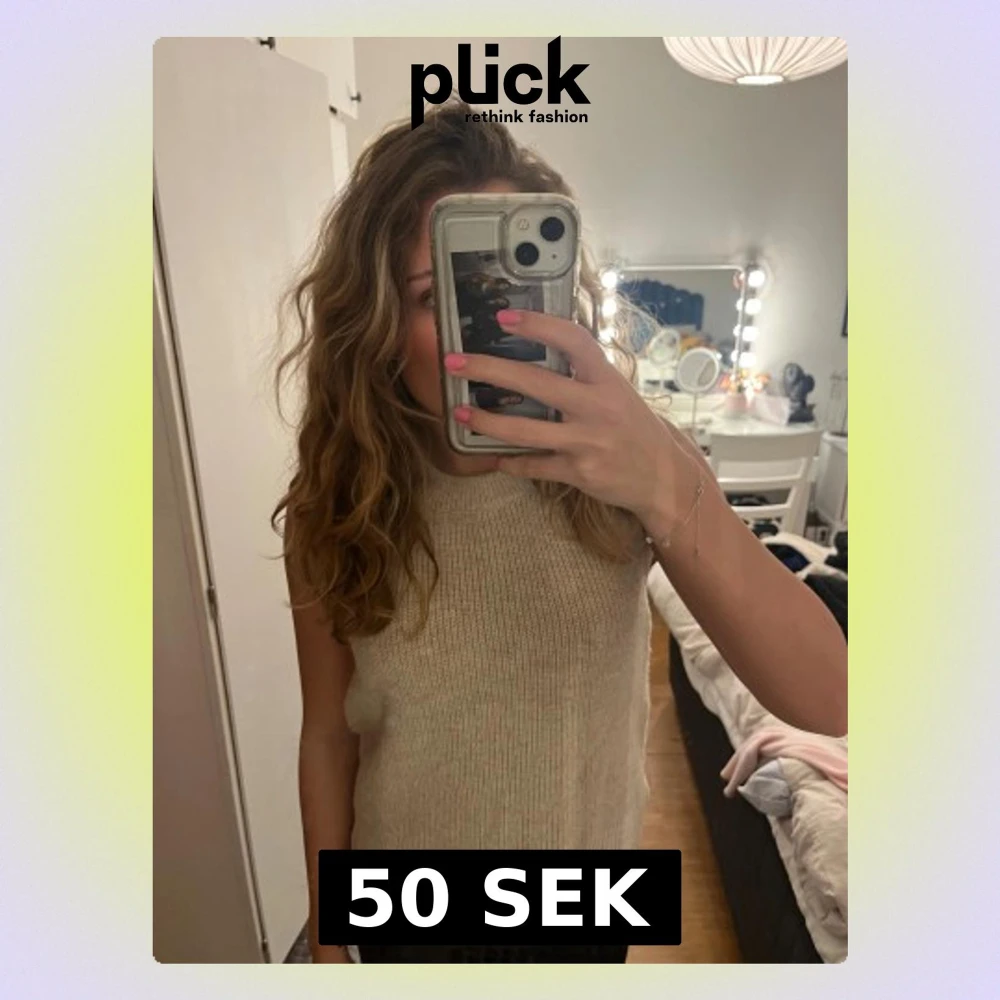 Säljer en beige stickad topp med rund hals och ribbad struktur. Modellen är ärmlös och har en mjuk, lite loose passform som är enkel att styla. Perfekt för dig som gillar neutrala färger och enkel design.