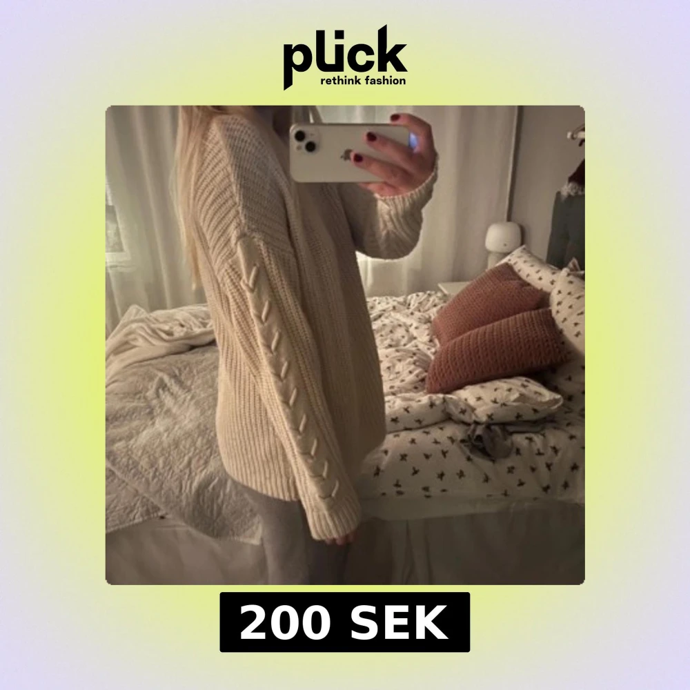 Mysig beige stickad tröja coola ärmar. Perfekt för kyliga dagar med sin varma och bekväma design. Tröjan har en hög krage och långa ärmar. Storlek L men är som en M. Lite oversize på mig som är S