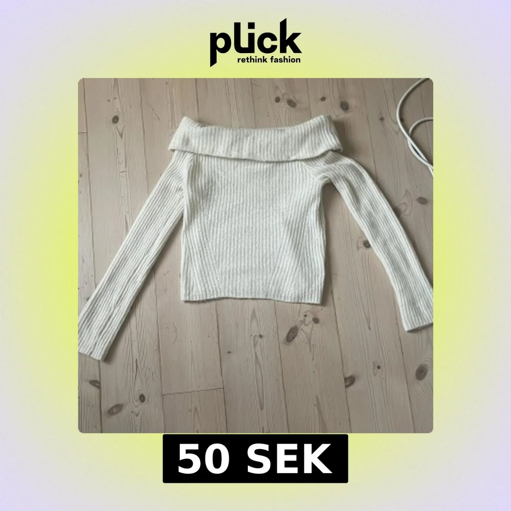 Offshoulder tröja från H&M i ribbad, stickad kvalitet. Färgen är ljusbeige och modellen har långa ärmar och bred krage som vilar över axlarna. I strl s och bra passform.