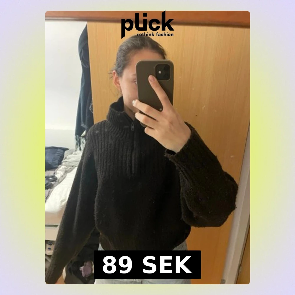 Mysig svart stickad tröja med half zip och hög krage. Tröjan har en loose passform och långa ärmar, perfekt för kyliga dagar. Enkel att matcha med jeans eller andra byxor för en avslappnad look.