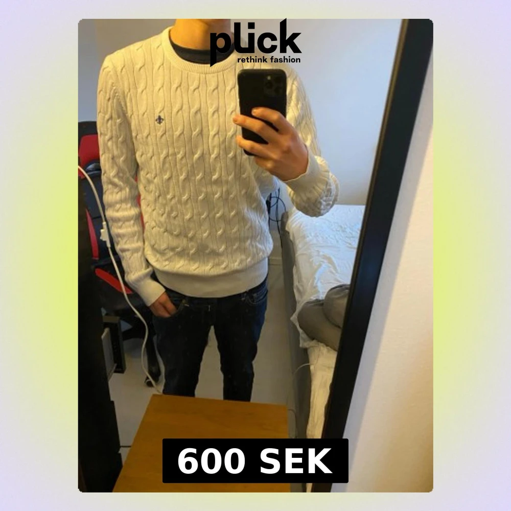 Säljer en vit kabelstickad tröja från Morris med rund halsringning och ribbade muddar. Tröjan har ett diskret Morris-logo broderat på bröstet och är tillverkad av bomull. Nypris 1799kr