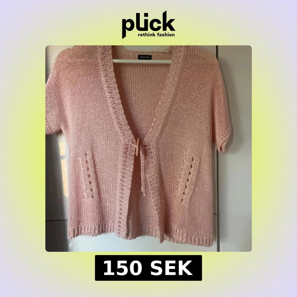 Ljusrosa stickad kofta med rosetter - Supergullig ljusrosa stickad kofta från Gina tricot med två stora rosetter framtill som knytning. Koftan är croppad, har långärmade ärmar och ett ribbat mönster. Perfekt för dig som gillar söta detaljer och mjuka material. Man kan knyta upp rosetterna!