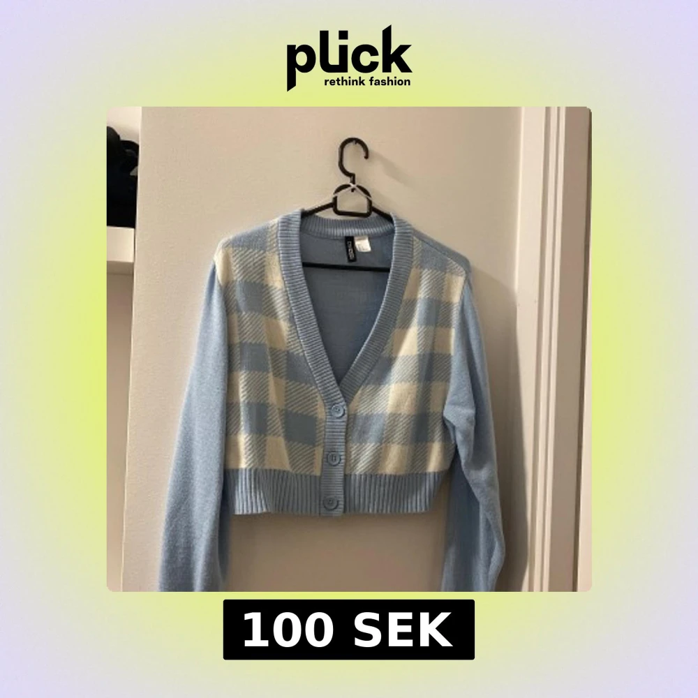 Superfin croppad kofta från H&M Divided i ljusblått med rutigt mönster i blått och vitt framtill. Tröjan har långa ärmar, ribbad kant och tre knappar framtill. Perfekt för dig som gillar preppy och söt stil.
