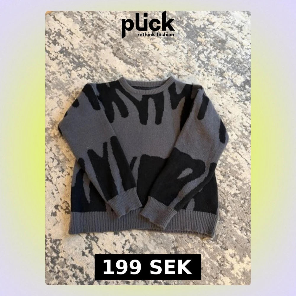 Säljer en grå stickad tröja med abstrakt svart mönster . Tröjan har rund halsringning, ribbade muddar och nederkant. Perfekt för dig som gillar en unik och trendig look. Materialet känns mjukt och bekvämt.