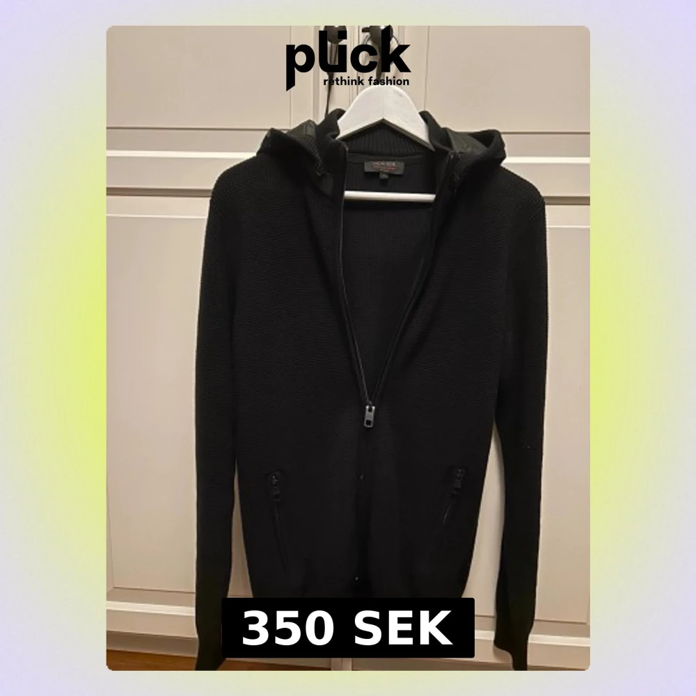 Säljer svart cardigan med dragkedja framtill och två fickor . Tröjan har en huva med glansig detalj och ribbade muddar vid ärmslut och nederkant. Perfekt för dig som gillar en enkel och stilren look.