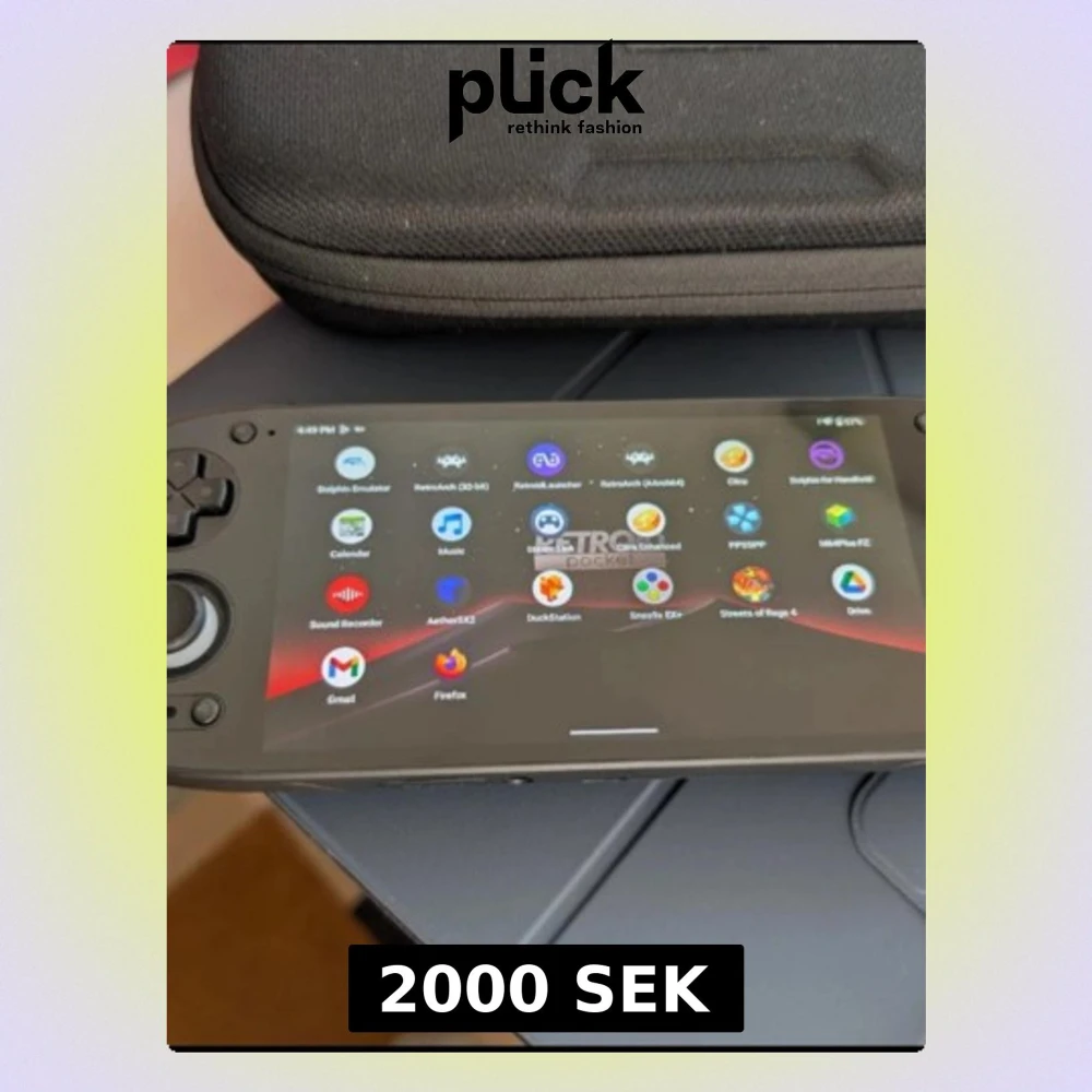 Säljer en svart handhållen spelkonsol med stor pekskärm och inbyggda styrspakar samt knappar. Konsolen har Android-gränssnitt och stöd för flera emulatorer och Steam-spel. Perfekt för retrospel och moderna titlar på språng.