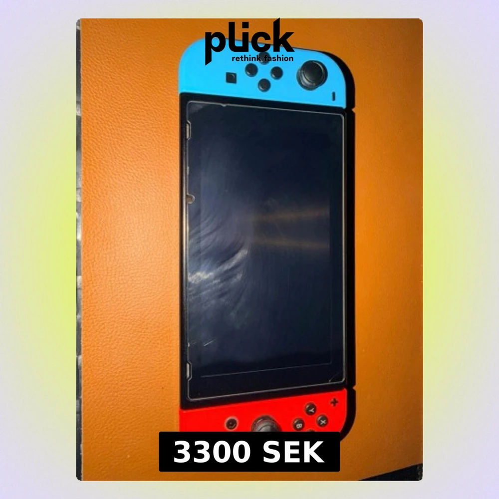 Nintendo Switch spelkonsol med en blå Joy-Con på vänster sida och en röd Joy-Con på höger sida. Konsolen har en stor skärm i mitten och är tillverkad i plast. Perfekt för gaming på språng eller hemma. Tre spel medföljer: Super Smash Bros Ultimate, Mario & Sonic at the Olympic Games och Luigi's Mansion 3. Två racing wheel kontroller och en pro controller med en liten och en stor väska för konsolen. Pris går att diskuteras