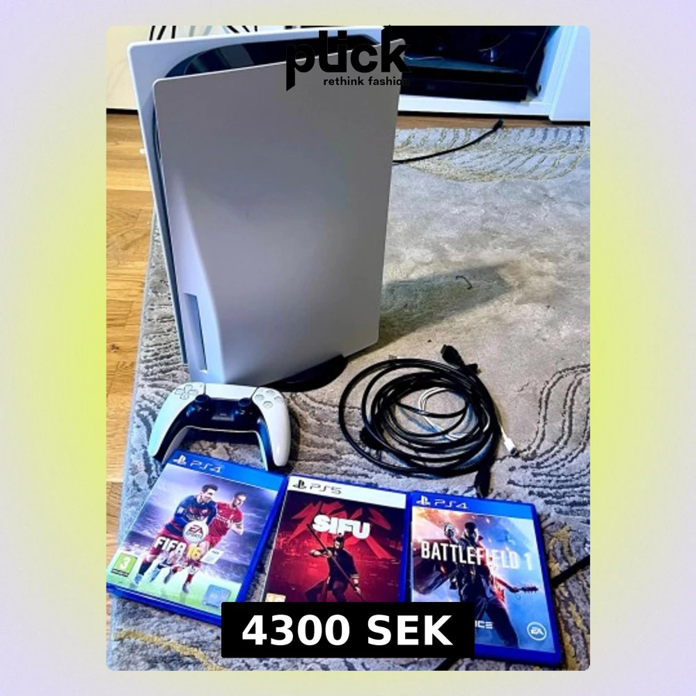 Playstation 5 konsol med en handkontroll och strömkabel. Tre spel ingår: FIFA 23, Sifu och Battlefield 2042. Allt i mycket gott skick. En lite bit plast borta på den separata foten som sitter under konsolen se bild. Bara ett kosmetisk liten sak. Allt fungerar perfekt och jag kommer nollställa konsolen vid köp