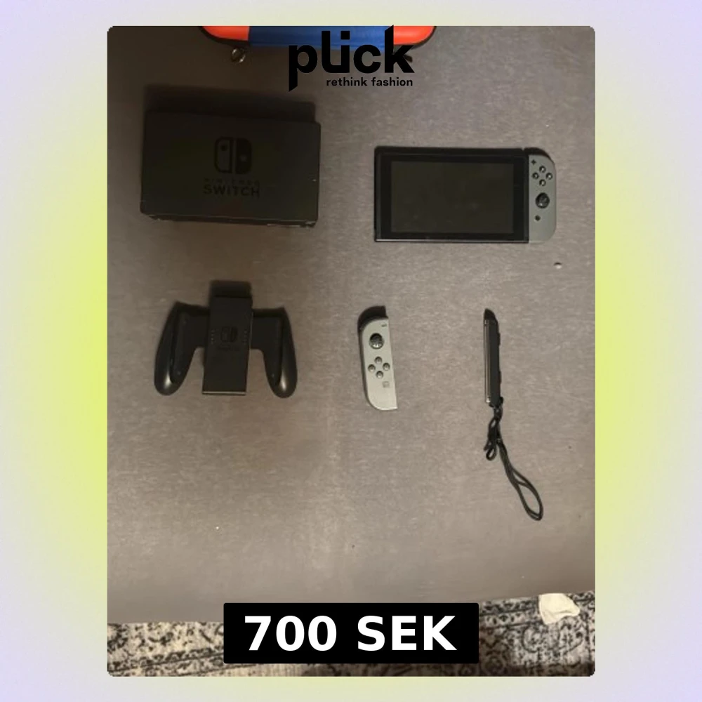 Nintendo Switch spelkonsol med två grå Joy-Con kontroller, dockningsstation, Joy-Con grip och handledsrem. Konsolen har en rektangulär form och är tillverkad i plast. Perfekt för gaming både hemma och på språng. Allt fungerrar fellfritt utom vänster controll. Själva nitendot har ett nytt batteri och funkar perfekt det ända som behövs är ett memory kort då jag inte har ett.