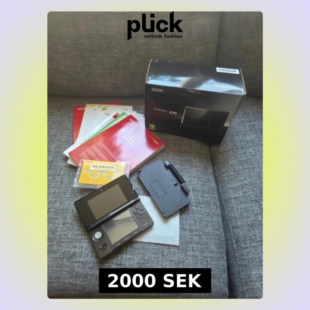 Säljer en svart Nintendo 3DS Cosmos Black med originalkartong, laddstation och manualer. Konsolen har dubbla skärmar, styrspak, knappar och 3D-funktion. Perfekt för portabelt spelande och kompatibel med både DS- och 3DS-spel.