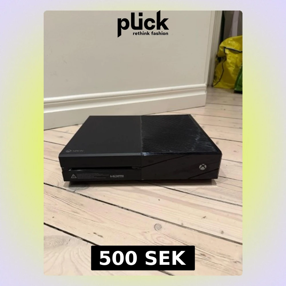 Säljer en svart Xbox One spelkonsol från Microsoft. Konsolen har en stilren, rektangulär design med matta och blanka ytor samt tydlig Xbox-logga på framsidan. HDMI-port finns på framsidan och konsolen är tillverkad i plast.