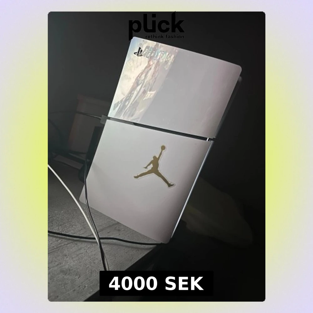 Säljer en vit PlayStation 4 med en snygg guldfärgad Jordan-logga på framsidan. Konsolen har en stilren, kantig design och är tillverkad i plast. Perfekt för gaming och ser riktigt clean ut i setupen.