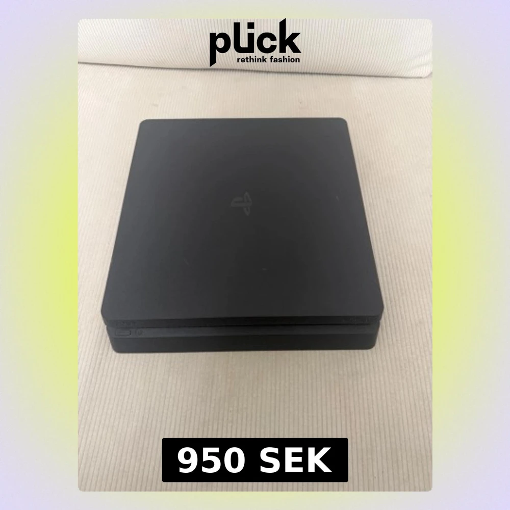 Säljer en svart PlayStation 4 Slim från Sony. Konsolen har en stilren, matt finish och den klassiska PlayStation-loggan på ovansidan. Formen är rektangulär med rundade hörn och den har USB-portar framtill för enkel anslutning av handkontroller och tillbehör ⚠️inga handkontroller ⚠️