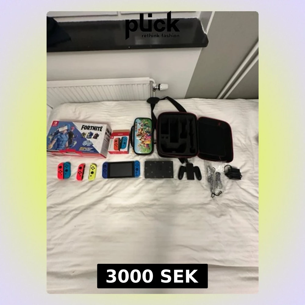 Nintendo Switch Fortnite Edition med blå och röda Joy-Con, extra neon Joy-Con, laddare, dockningsstation, handkontrollhållare, Fortnite-låda, Mario-väska och svart bärväska. Perfekt för gaming hemma eller på språng.