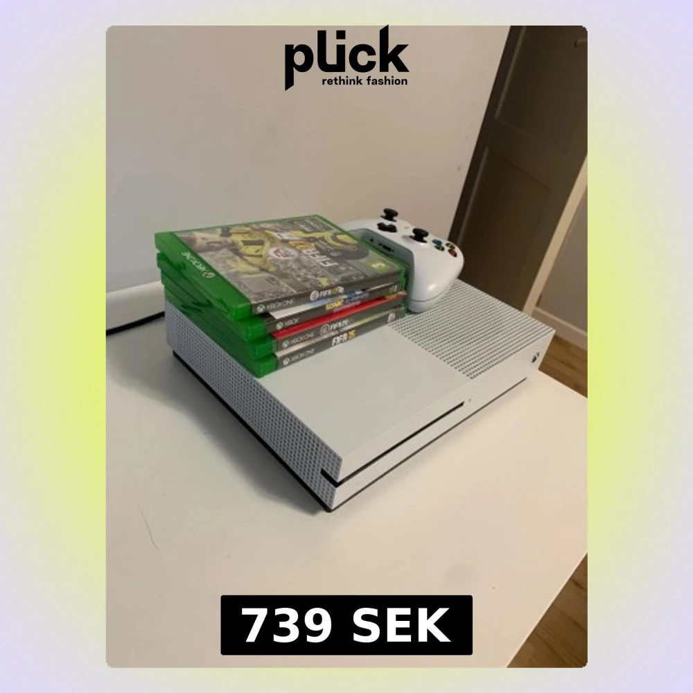 Säljer en vit Xbox One S med tillhörande vit trådlös handkontroll och flera spel, bland annat FIFA 15, FIFA 17, FIFA 20 och Sonic Mania. Konsolen har en stilren, rektangulär design i plast med ventilerad ovansida och svarta detaljer.