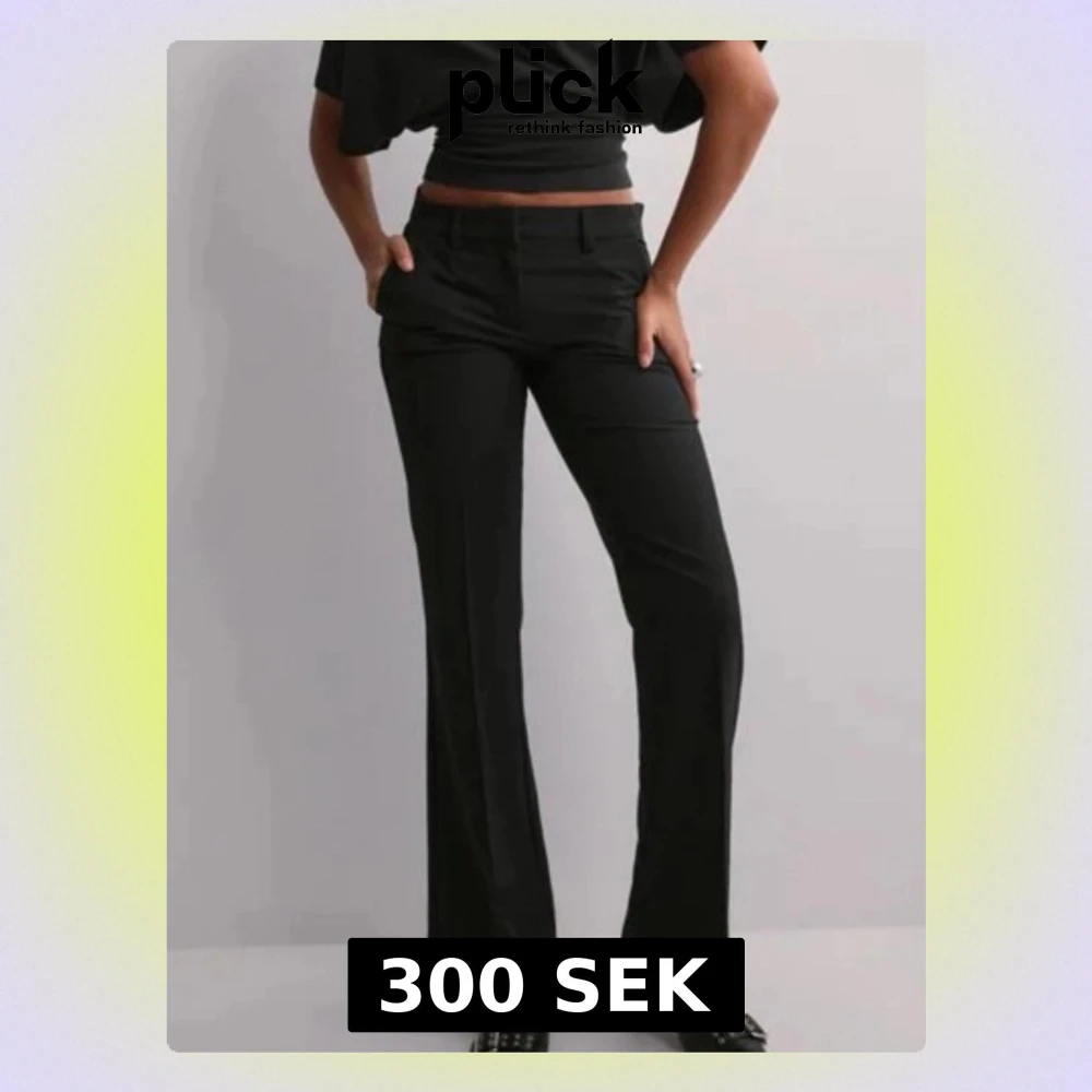 Snygga svarta kostymbyxor med raka ben och pressveck. Byxorna har hällor för skärp, fickor fram och fuskfickor bak. Perfekta för en clean och stilren look. Materialet ser ut att vara en mjuk och följsam mix, troligen polyester eller viskos.