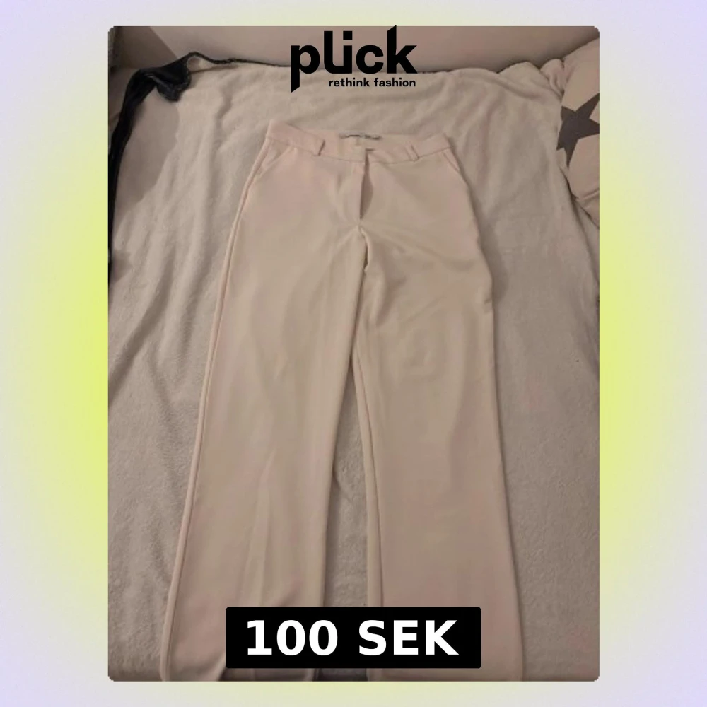 Snygga beige kostymbyxor med låg midja och vida ben. Klassisk design med bälteshällor och pressveck framtill. Perfekta för en clean och stilren look. Materialet känns mjukt och har ett fint fall.