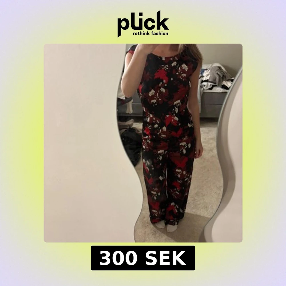 Supersnygg svart jumpsuit från ONLY med röda och vita blommor. Vida ben, öppen rygg och kan bäras off-shoulder. Sitter tajt upptill och har ett flowy fall nertill. Perfekt för dig som vill sticka ut med ett coolt mönster och skön passform.