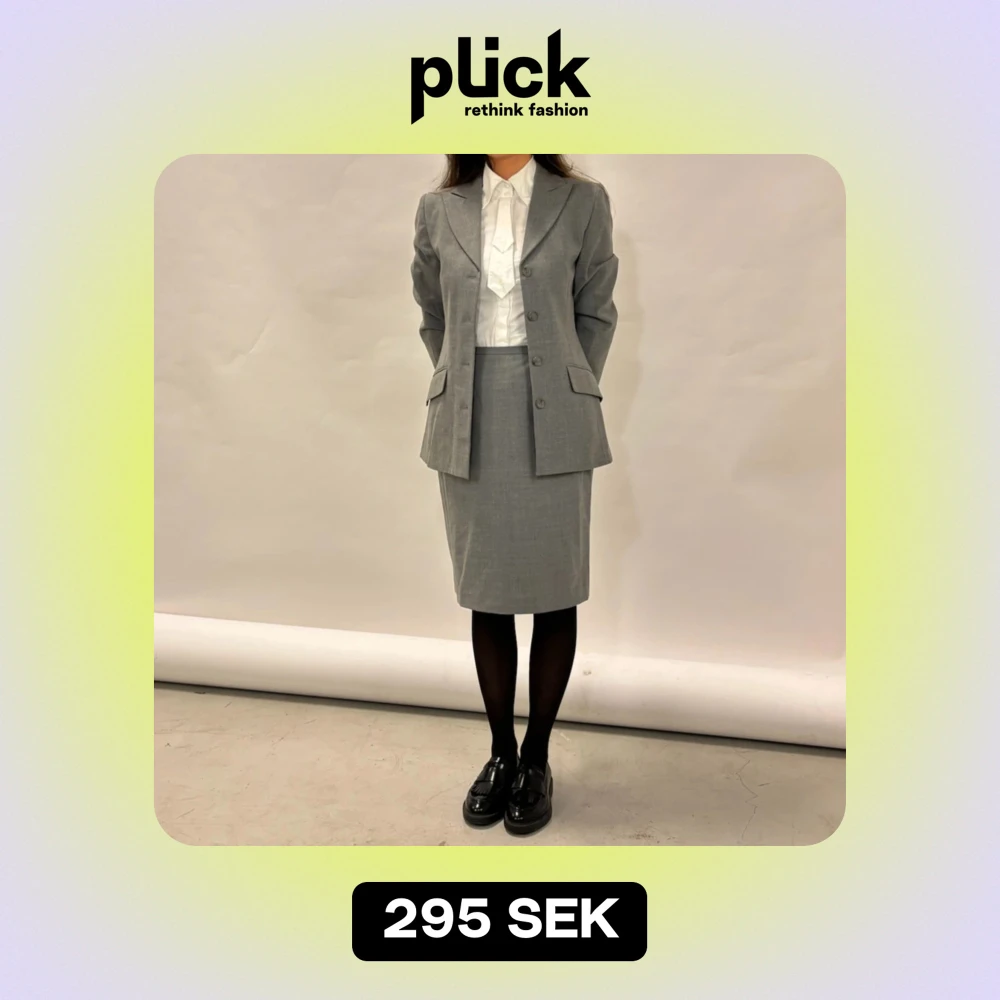 Säljer en elegant grå kavaj och matchande kjol från Miss Philippe. Kavajen har tre knappar och klassiska slag, medan kjolen är knälång med en diskret slits bak. Perfekt för kontoret eller formella tillfällen. Både kavajen och kjolen är i mycket bra skick och ger en stilren look.