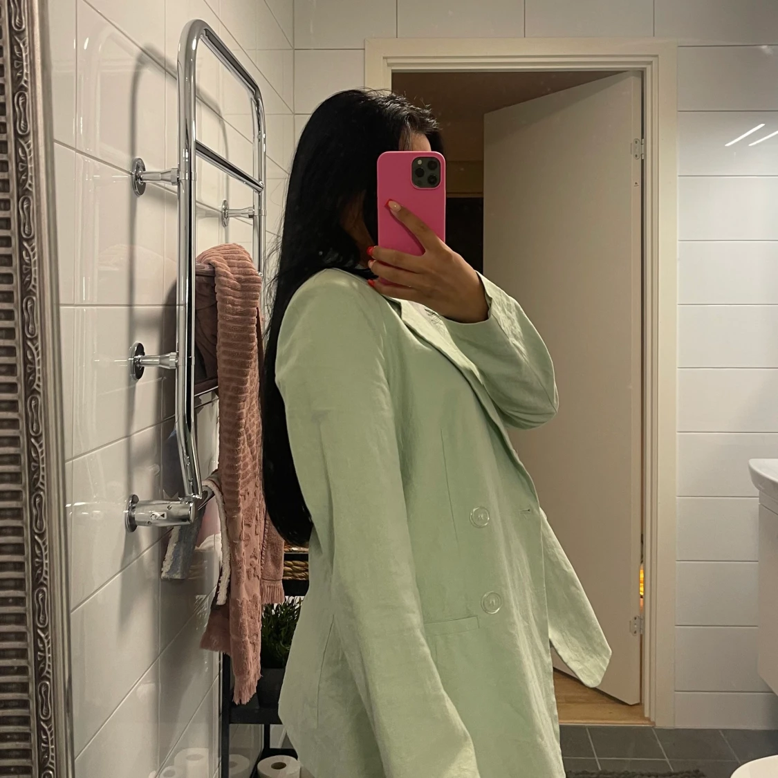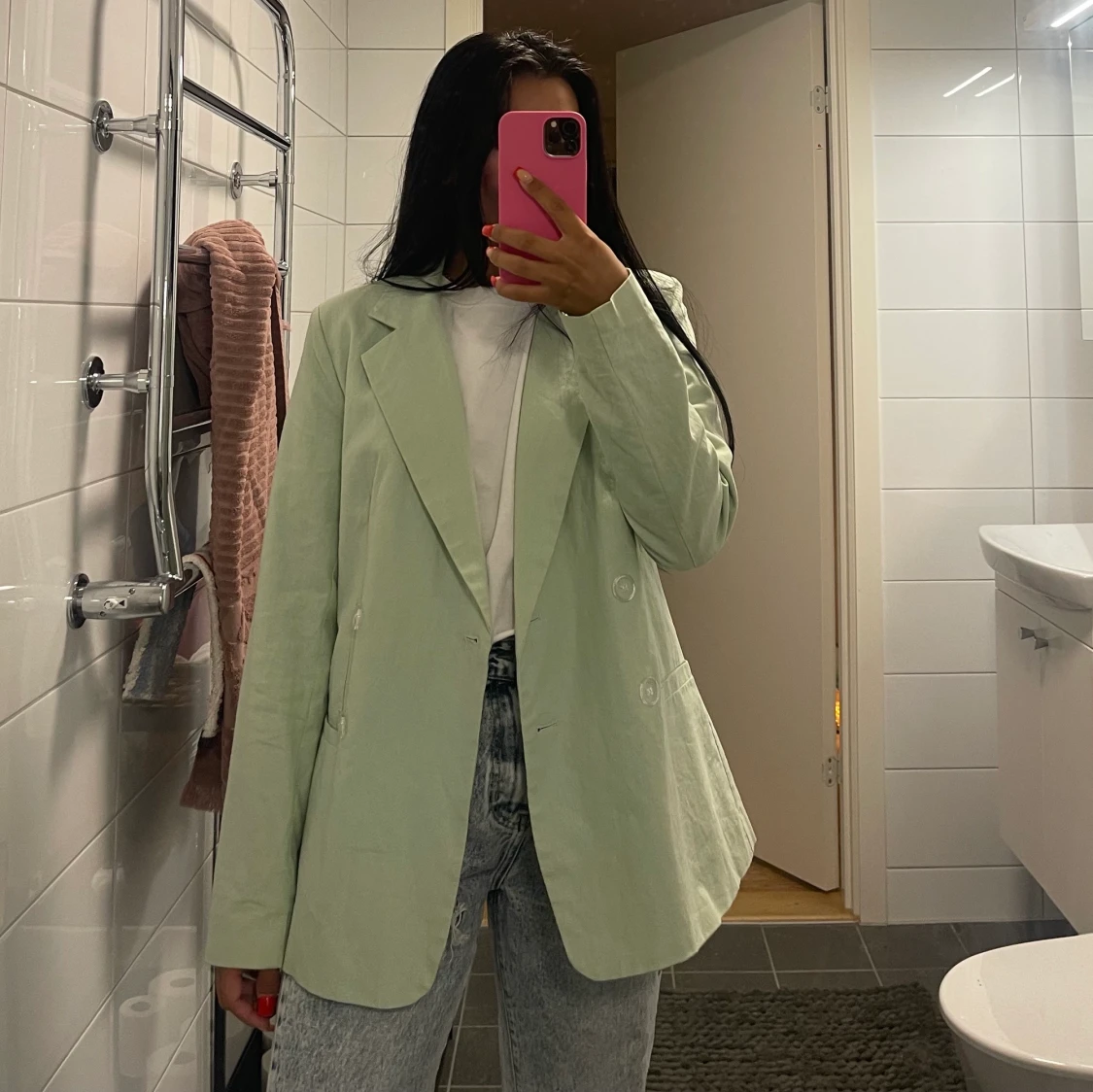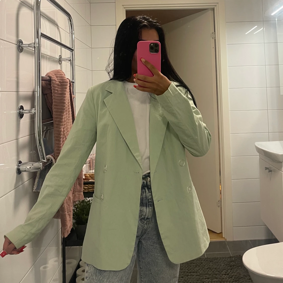 En ljusgrön kavaj, super snygg använd cirka 2-3 gånger😍