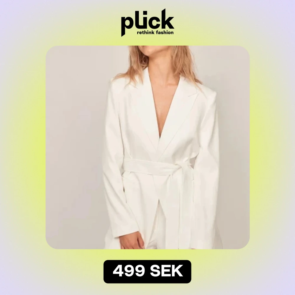 Säljer en elegant vit kavaj med en knappstängning och ett avtagbart skärp. Storlek 36