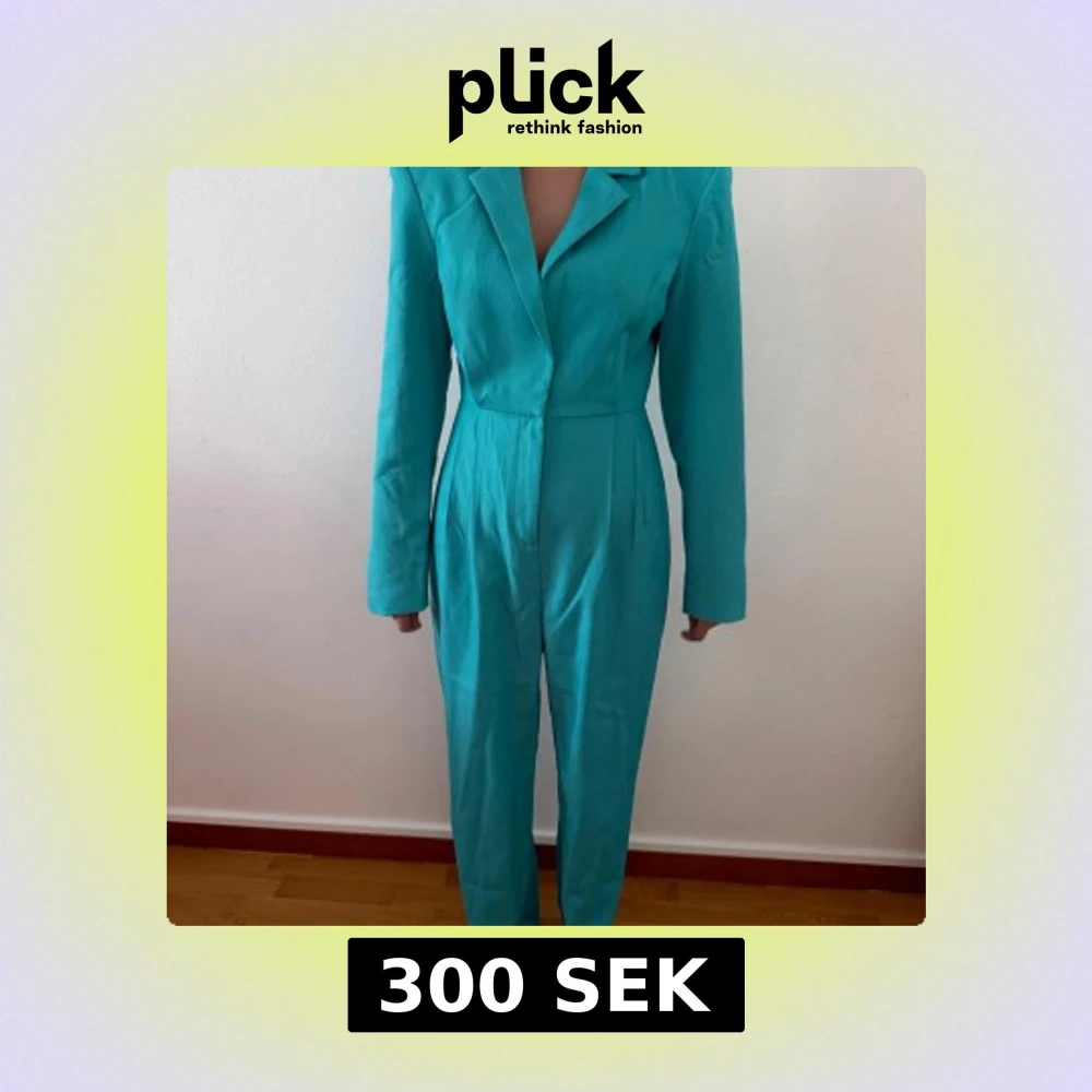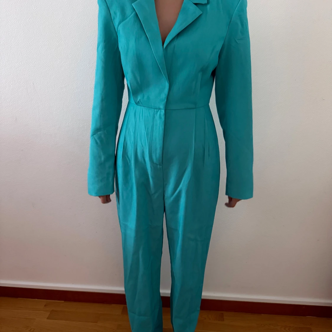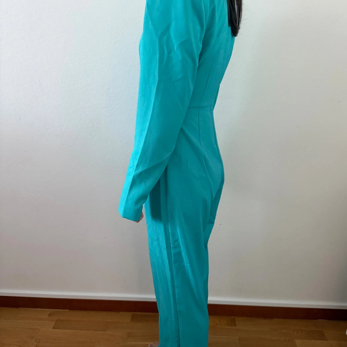 Snygg turkos jumpsuit med långa ärmar och markerade axelvaddar. Djup v-ringning och klassisk krage ger en cool och stilren look. Byxdelen är rak och materialet känns lätt och smidigt. Perfekt för dig som vill sticka ut med färg och form.