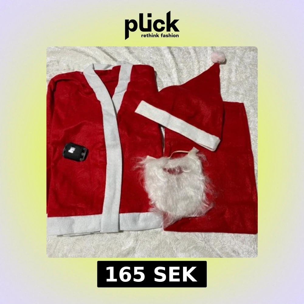Röd tomtedräkt med vita detaljer, inkluderar kappa, byxor, luva med vit boll och ett vitt skägg. Perfekt för julens alla upptåg och maskerader. klassisk tomtestil