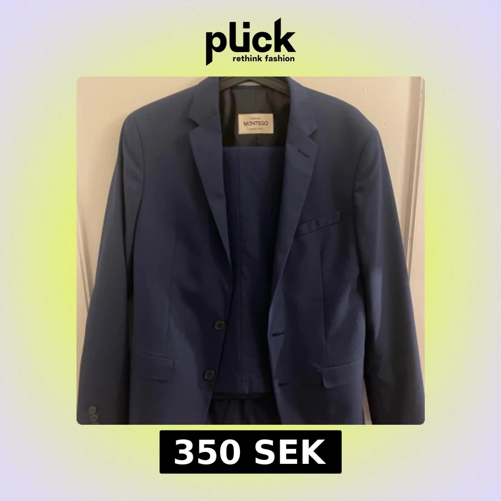 Snygg marinblå kostym från Montego med klassisk kavaj och matchande byxor. Kavajen har två knappar, smala slag och flera fickor. Fodret har coola detaljer med små illustrationer av accessoarer. Perfekt för dig som vill ha en stilren och modern look.