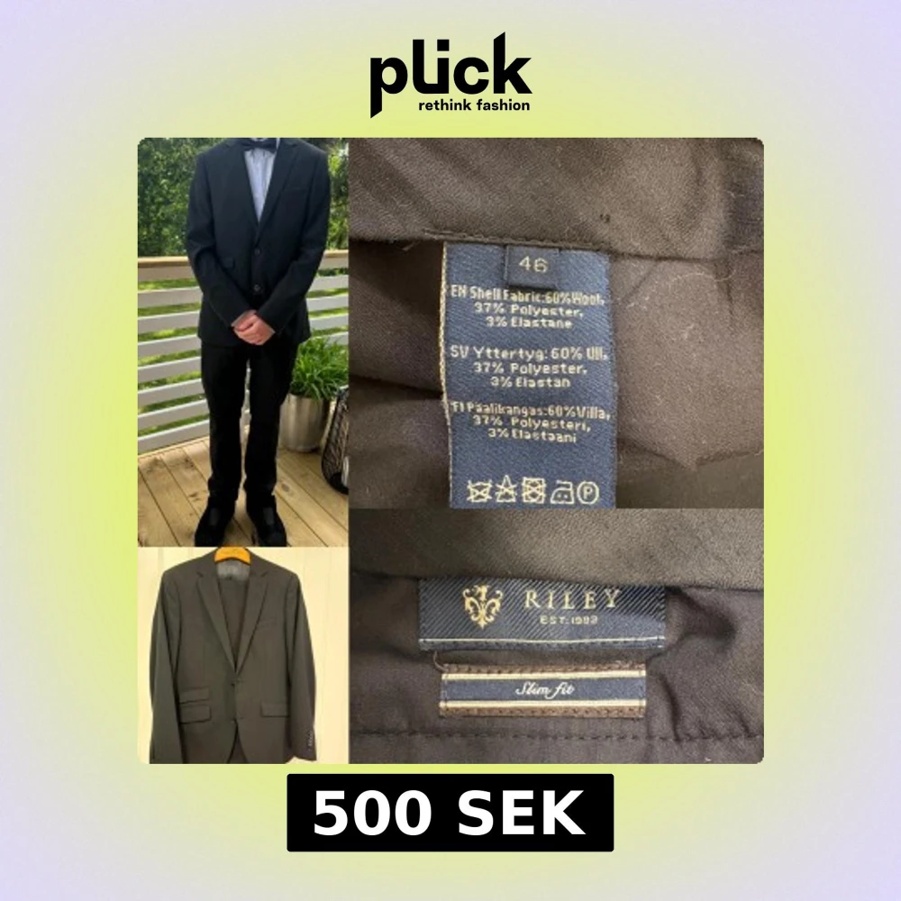 Säljer en svart kostym från Riley i slim fit-modell. Kavajen har klassisk design med två knappar, tre fickor fram och fyra knappar vid ärmslut. Materialet är en blandning av ull, polyester och elastan för en bekväm passform.