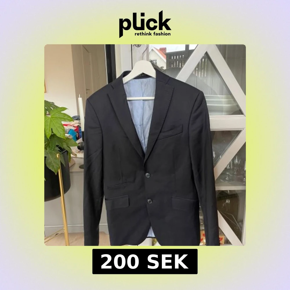 Stilren svart kavaj från Zara Man i storlek 46. Klassisk modell med två knappar framtill, fickor med lock och en bröstficka. Fodret är ljusblått med tunna ränder. Perfekt för en dressad look.