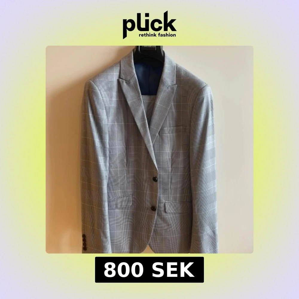 Snygg grå kostym med rutigt mönster från Lindbergh White. Kavajen har två knappar framtill, klassisk krage och fickor med lock. Byxorna har pressveck och knappdetalj bak. Perfekt för bal eller student.