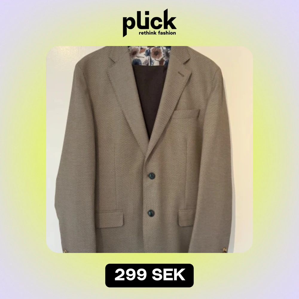 Säljer en snygg beige kavaj från Dressmann i storlek 52 (short). Kavajen har ett diskret mönster och är utrustad med två knappar framtill. Insidan är fodrad med ett blommigt mönster i blått och brunt. Perfekt för både fest och vardag!