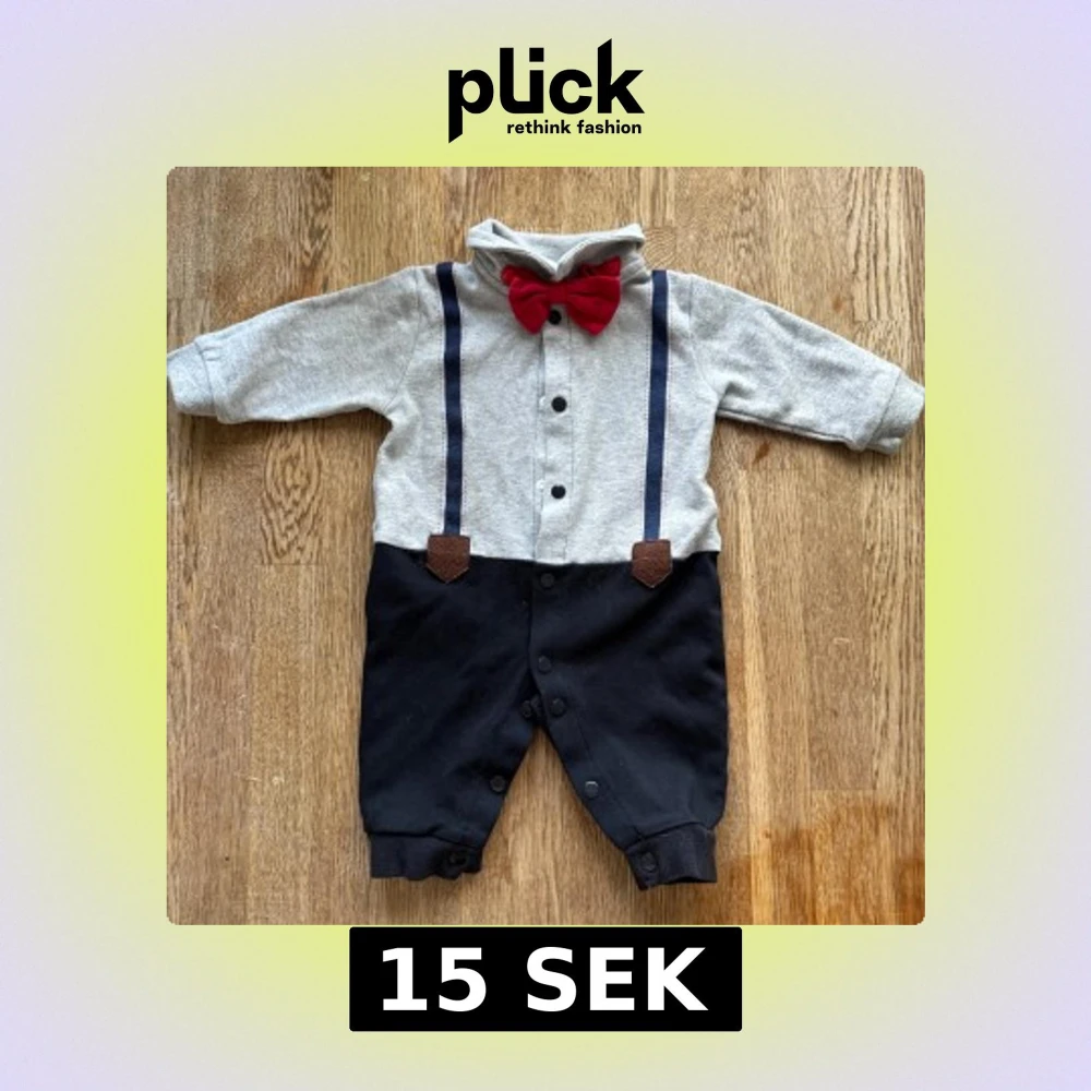 Supersöt byxdress för baby med grå överdel, svarta byxben och en röd rosett vid halsen. Tryckknappar framtill och längs benen gör den enkel att ta på. Dekorativa mörkblå hängslen och bruna detaljer framtill. Mjuk bomullskänsla, perfekt för chill dagar.