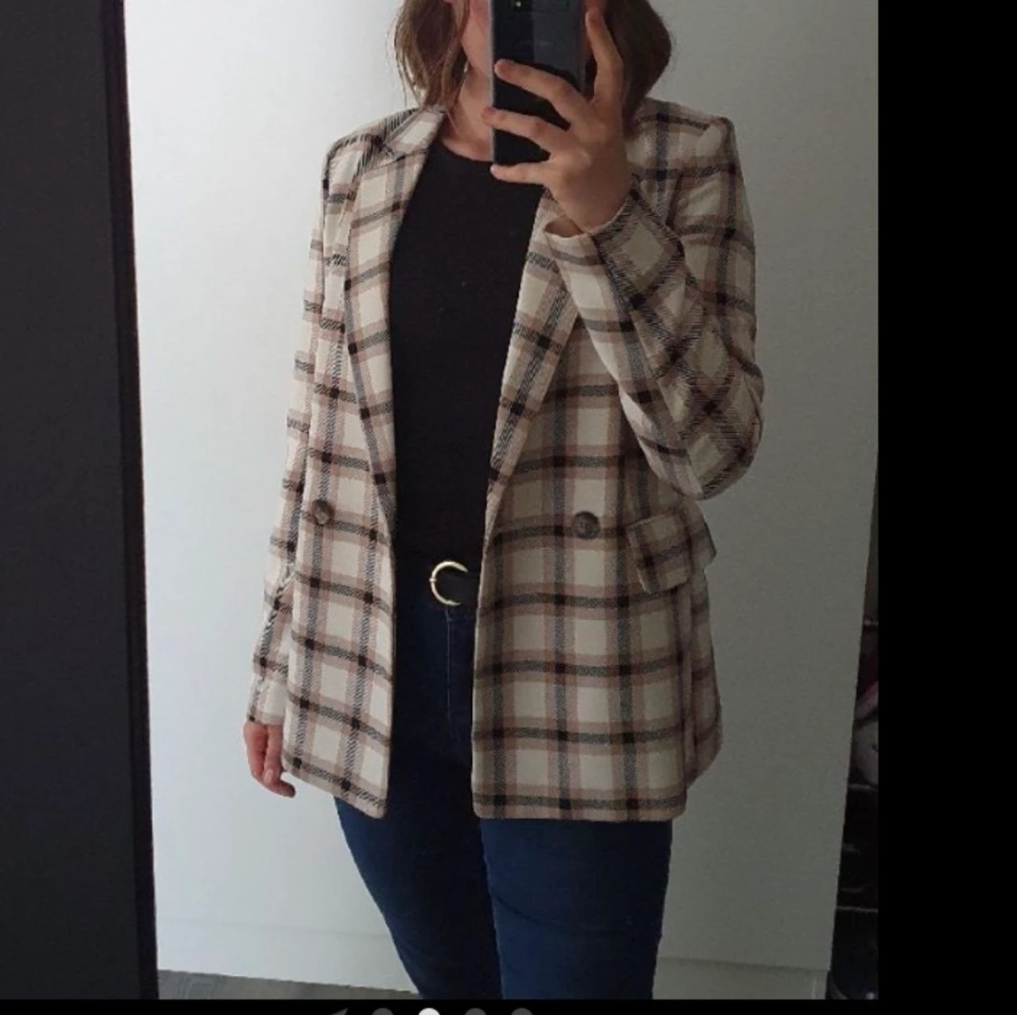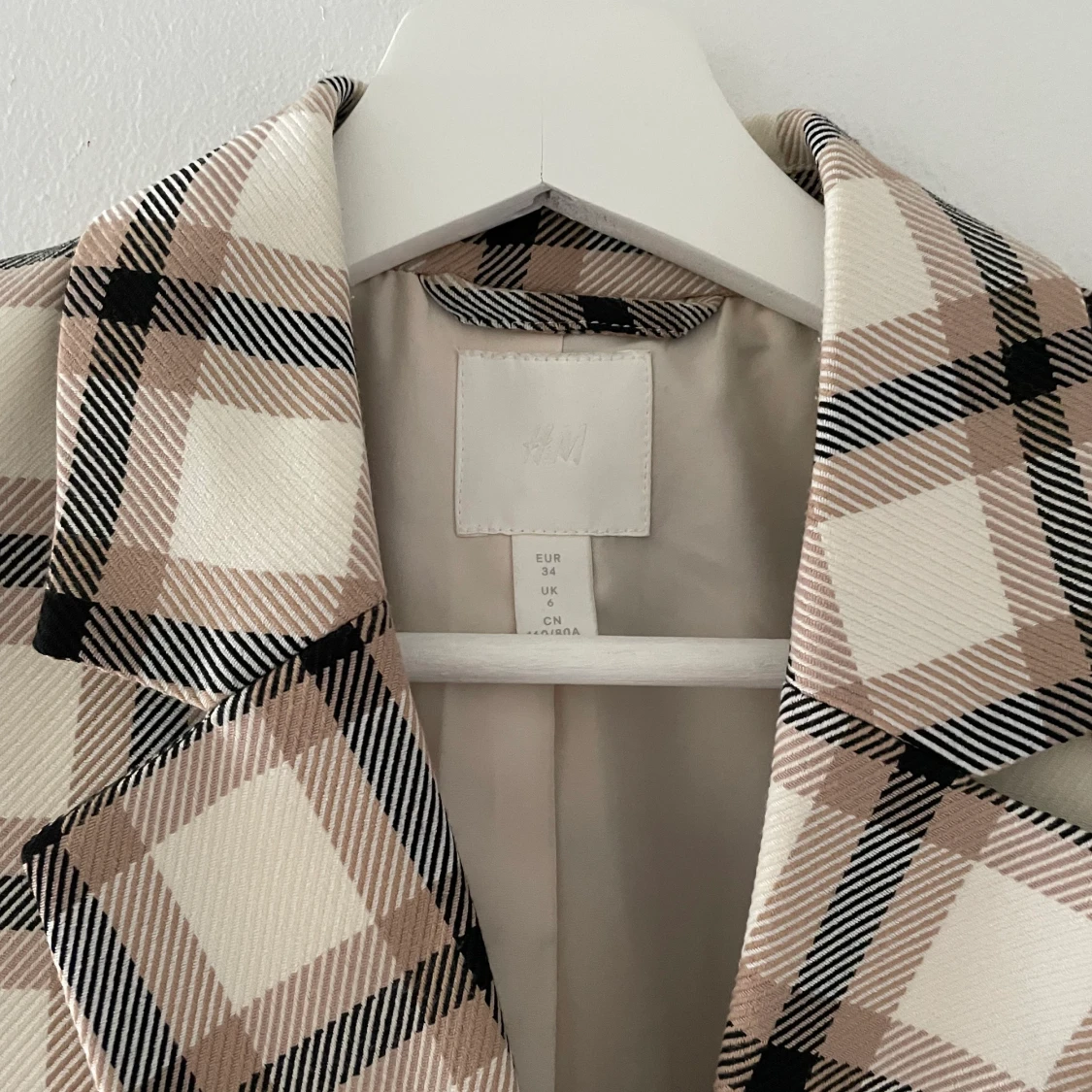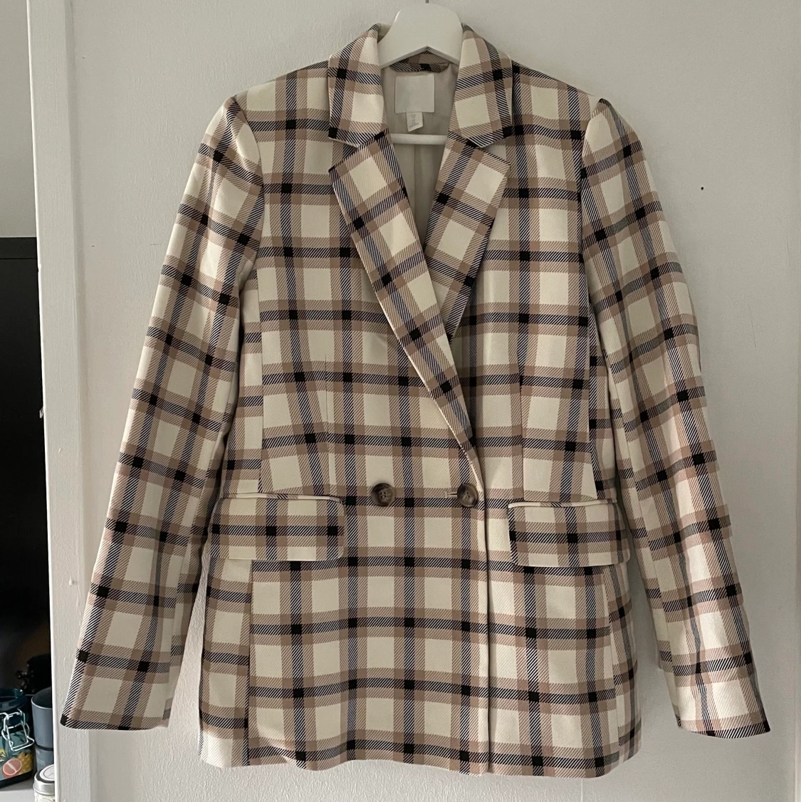 Rutig kavaj i beigea kulörer. Det är en storlek 34 men den passar en 36a också plus att den är lite oversized i modellen. Från början är den från H&M men jag köpte den av en tjej på Tise, tredje bilden är hennes för att se passform ;)