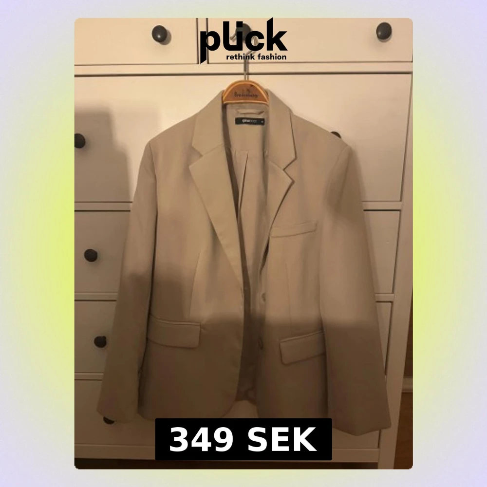 Stilren beige kavaj från Gina Tricot med klassisk krage och två fickor med lock framtill. Kavajen har en rak passform och stängs med knappar. Perfekt för en clean och modern look.
