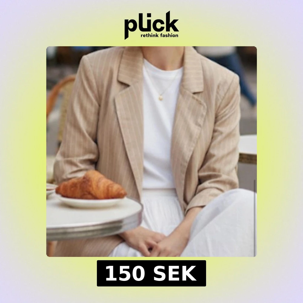 Snygg beige kavaj med smala vita ränder från PrettyLittleThing. Klassisk modell, oversize passform, lätt axelvaddering.