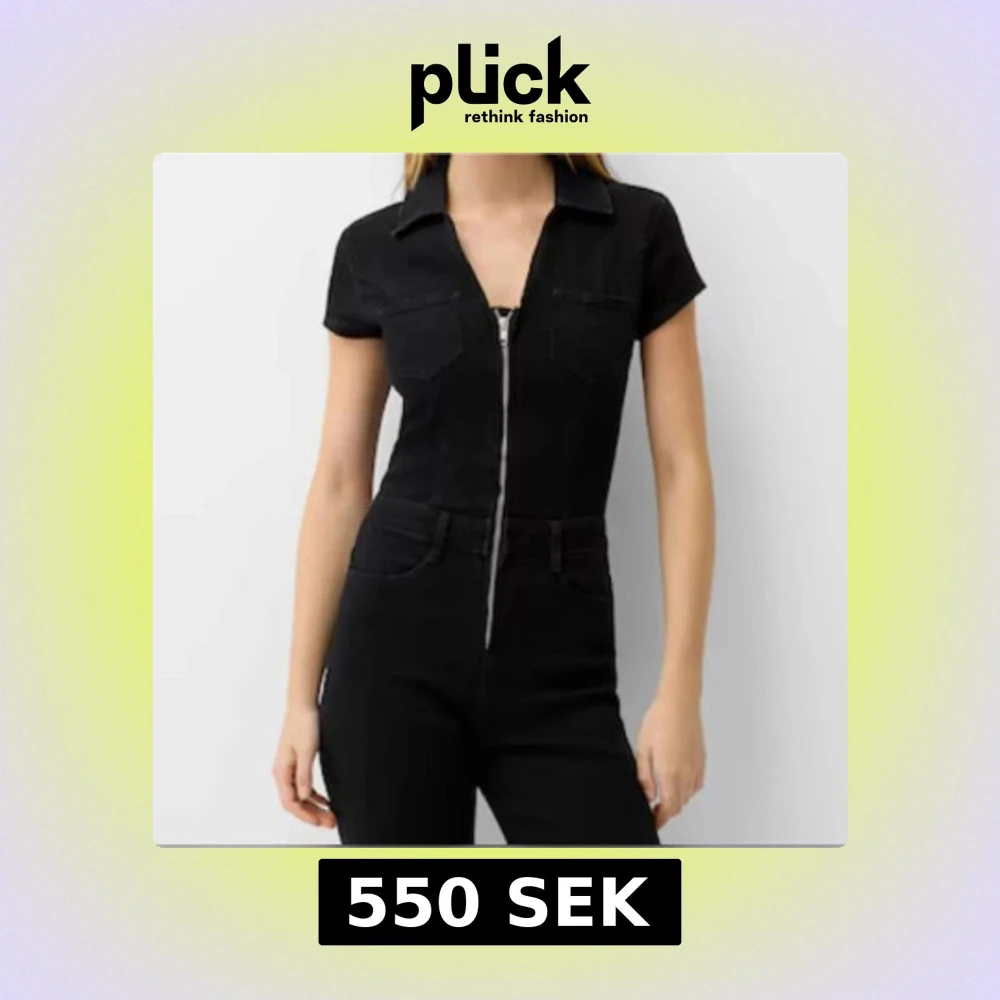 Snygg svart jumpsuit med korta ärmar, krage och raka vida ben. Framtill finns en silverfärgad dragkedja hela vägen ner samt två bröstfickor. Jumpsuiten har en stilren look och markerad midja, perfekt för dig som gillar minimalistisk stil.