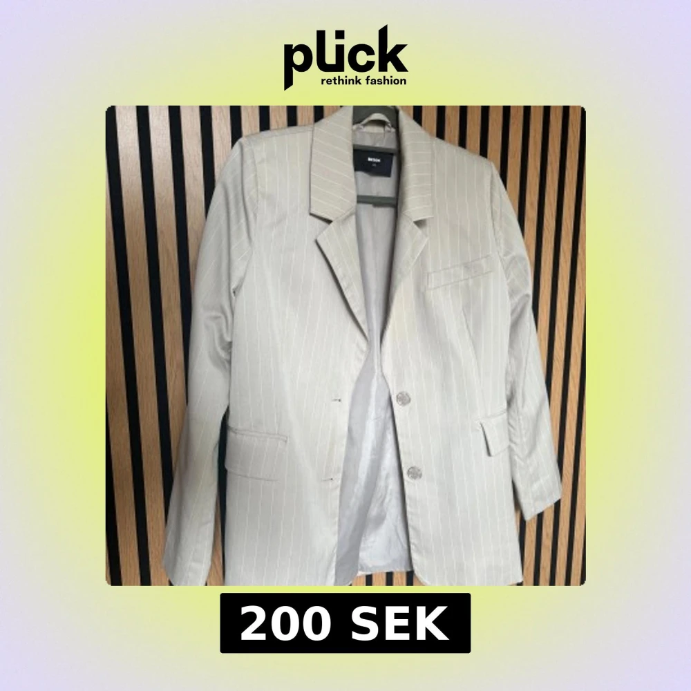 Snygg beige kavaj från Bik Bok med smala vita ränder. Klassisk krage, två knappar framtill och fickor med lock. Perfekt för dig som gillar stilrena och trendiga plagg. Passar till både jeans och kostymbyxor.