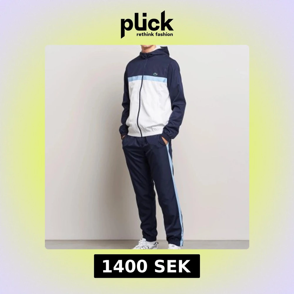 Snygg träningsdress från Lacoste i mörkblått och vitt med ljusblå detaljer. Jackan har huva, dragkedja och elastiska muddar. Byxorna har en ljusblå rand längs sidorna och resår vid benslut. Perfekt för dig som gillar sportig stil.