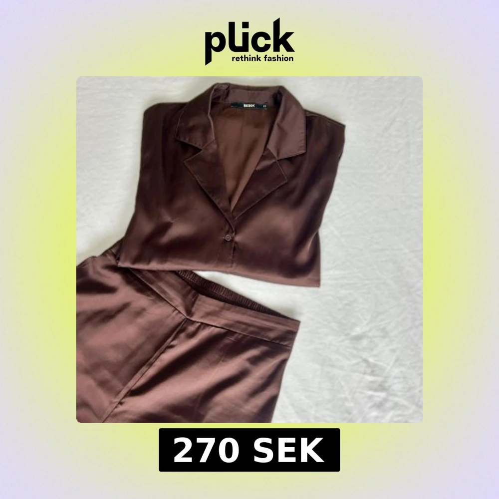 Snyggt brunt set från Bik Bok i glansigt satinmaterial. Skjortan har klassisk krage och knäppning framtill, byxorna är raka och har resår i midjan. Båda storlek xs 💕