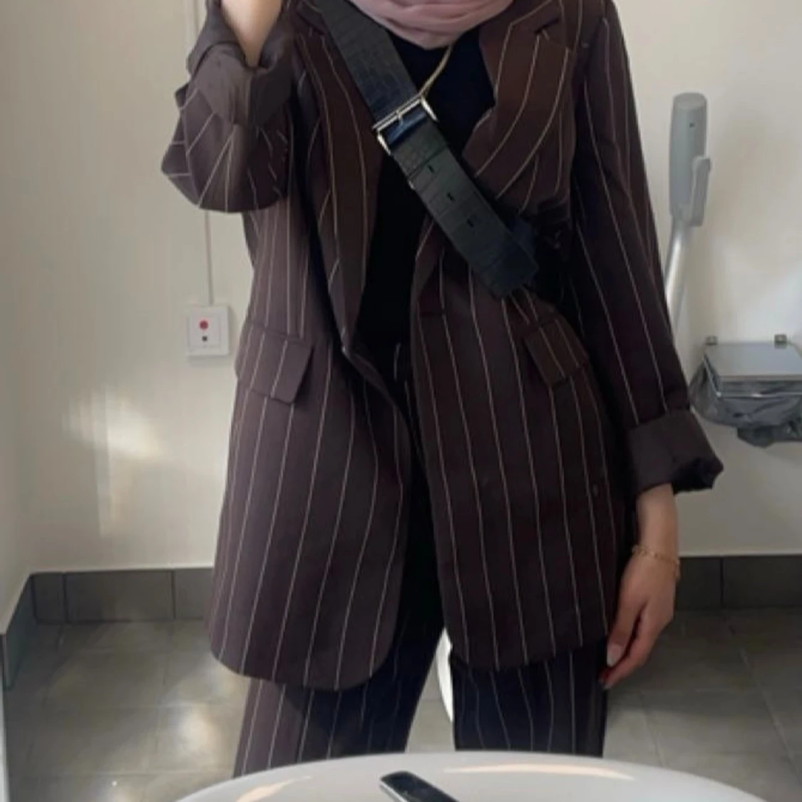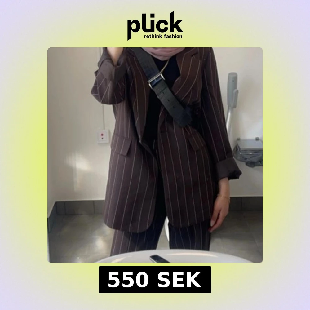 Säljer en brun kostym med smala vita ränder. Kavajen har klassisk passform, slag och fickor med lock. Matchande byxor med samma randiga mönster. Perfekt för dig som vill ha en stilren och trendig look.