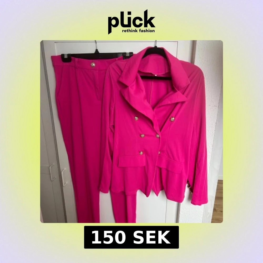 Snygg chockrosa kostym med dubbelknäppt kavaj och matchande byxor. Kavajen har bred krage, dekorativa guldknappar och fickdetaljer. Byxorna är raka och höga i midjan. Perfekt för dig som vill sticka ut med färg och stil.