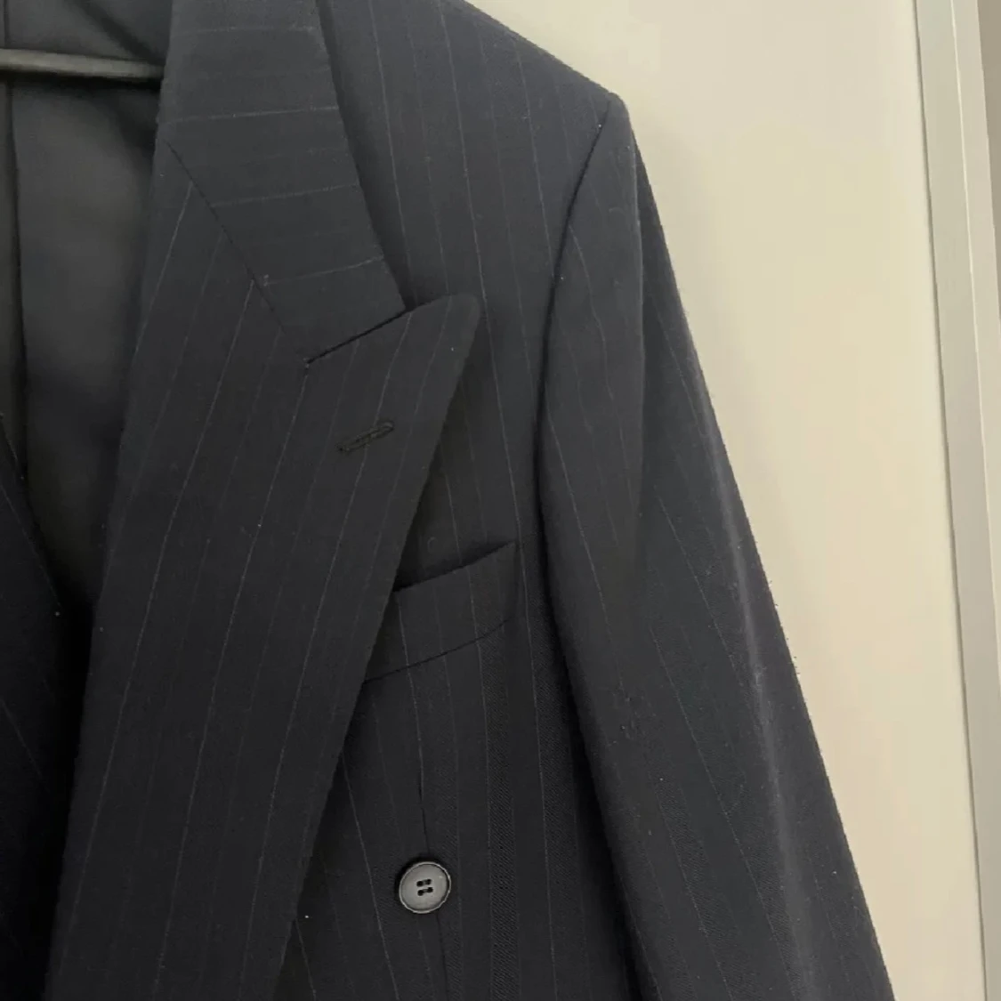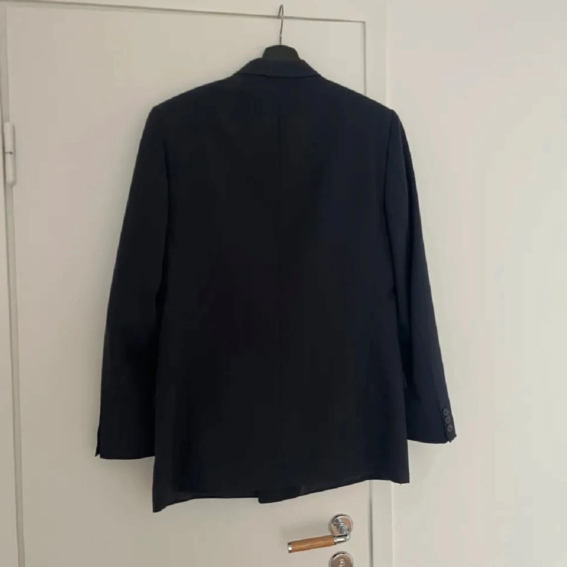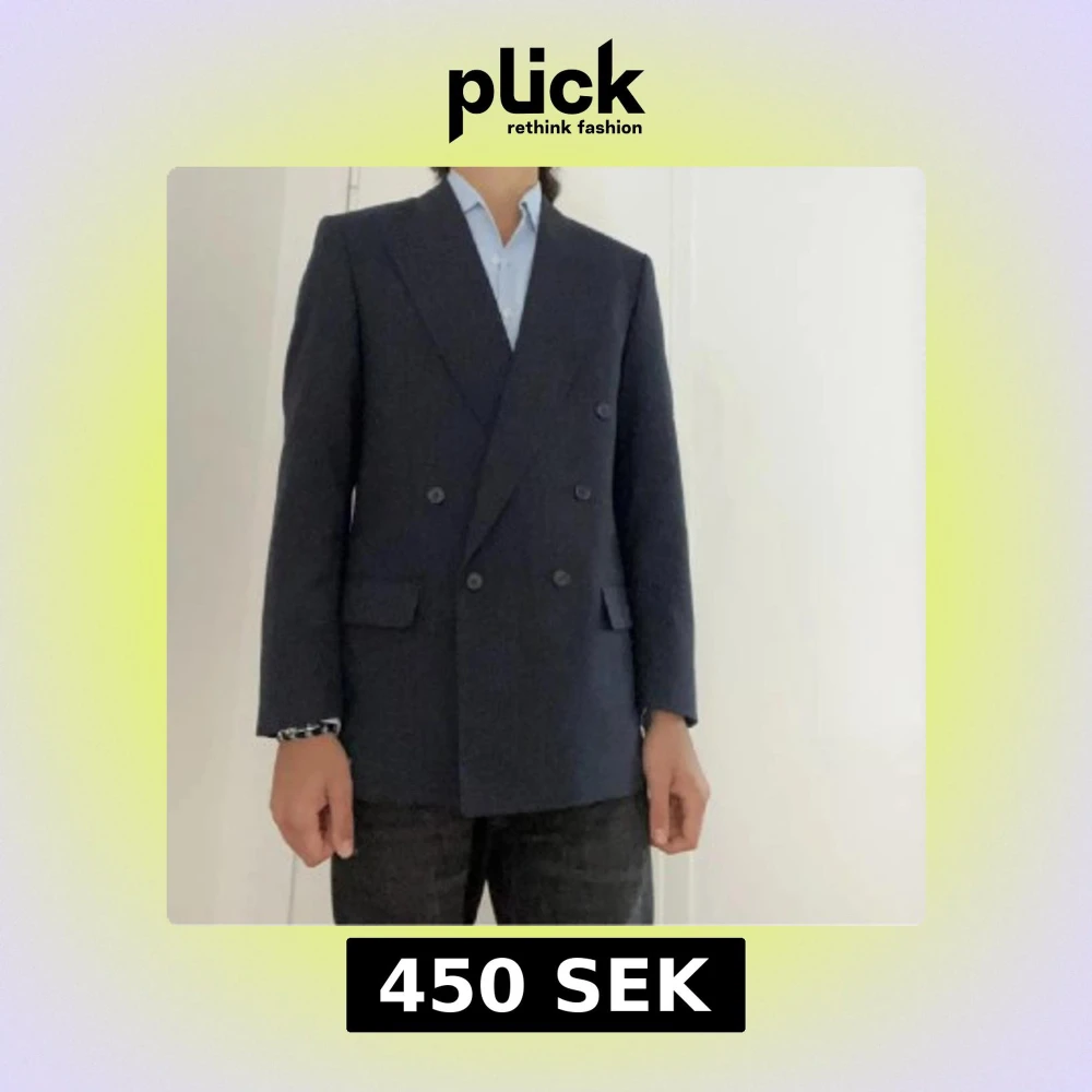 Säljer en stilren mörkblå kavaj med diskreta vita ränder och dubbelknäppning. Klassisk passform med breda slag, fickor med lock och fyra knappar framtill. Perfekt för dig som gillar en dressad look med edge.